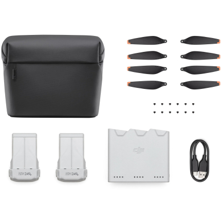 Комплект DJI Mini 3 Fly More включает в себя: чехол для переноски, Два комплекта запасных пропеллеров, Две запасные батареи, Чехол для зарядки, Кабель USB-A- USB-C.